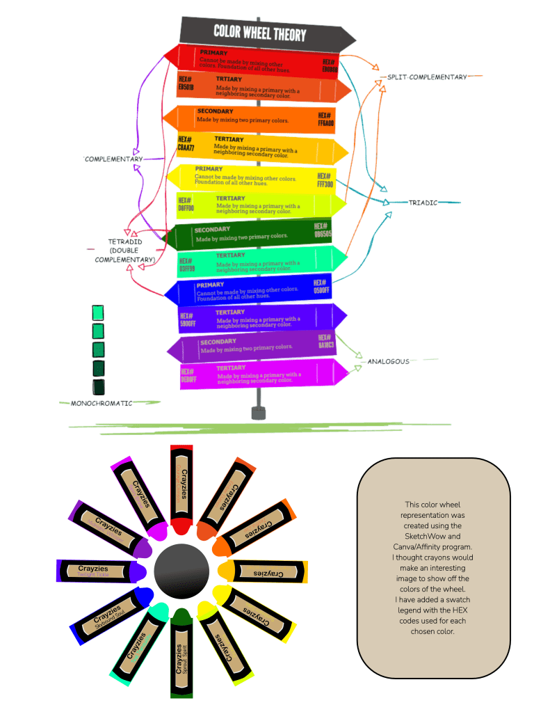 Week 02, in DCC180, asked us to design an infographic of a color wheel. We were not to directly copy an image from the internet, but rather design it ourselves. It was to convey the various aspects of color theory. I thought crayons, would be a delightful way to show the essential colors of the color wheel. When placing the HEX codes for the colors I selected, I thought a sign post would work well.